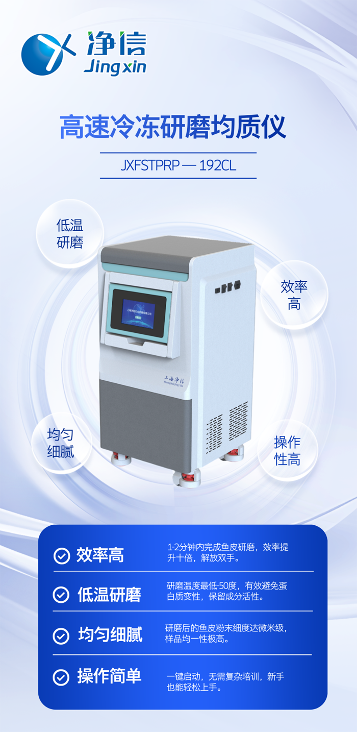 實驗背景:魚皮中富含膠原蛋白等活性成分,是美容保健、功能食品研發(fā)的熱門原料。但在實驗分析前,常需將魚皮研磨成均勻細粉,選對儀器,實驗事半功倍。凈信高速冷凍研磨均質儀助您輕松解決研磨問題!